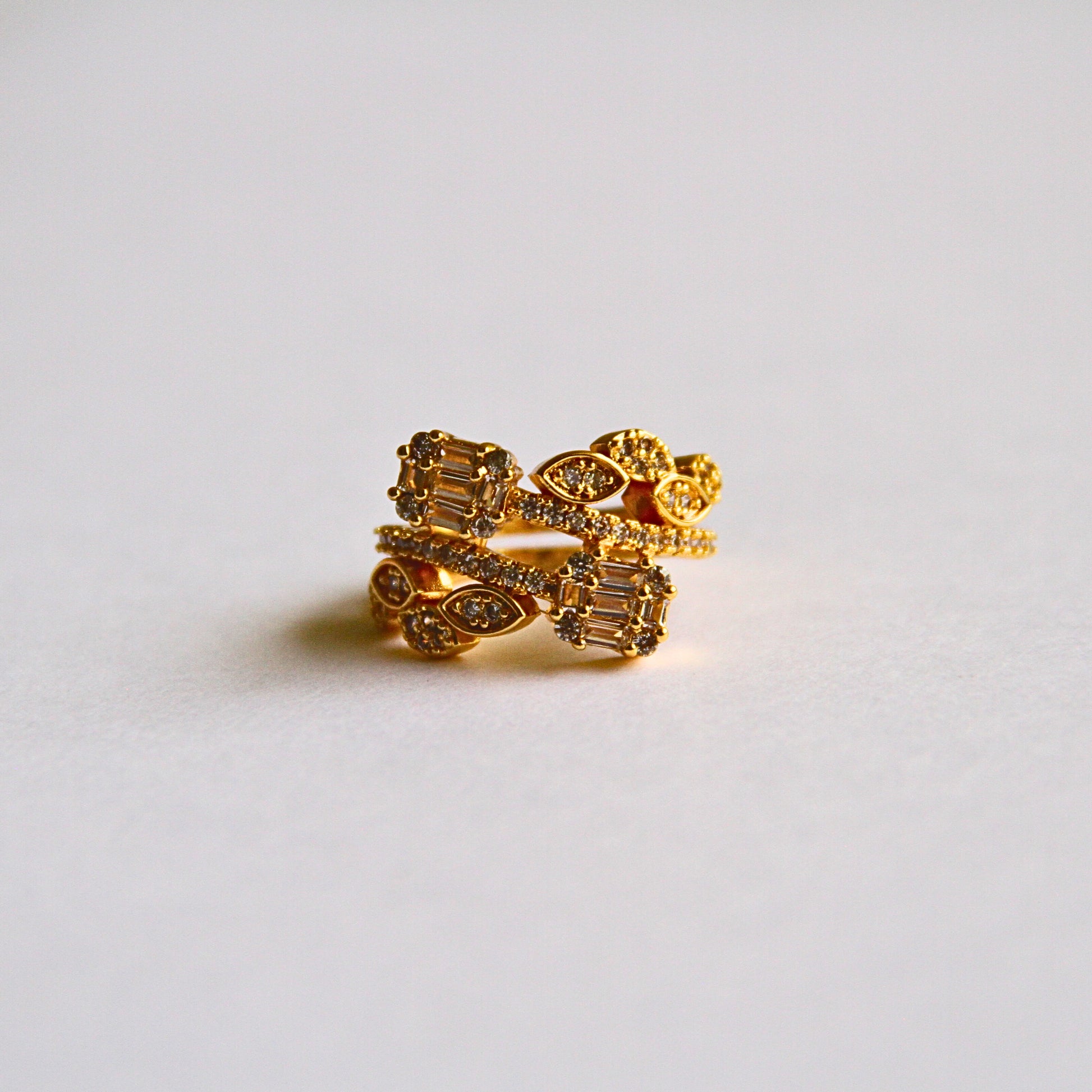 Elevate your look with this designer gold ring, adorned with shimmering crystal baguettes and marquise stones. Its layered band design adds a touch of sophistication — ideal for evening wear, gifting, or when you simply want to shine.