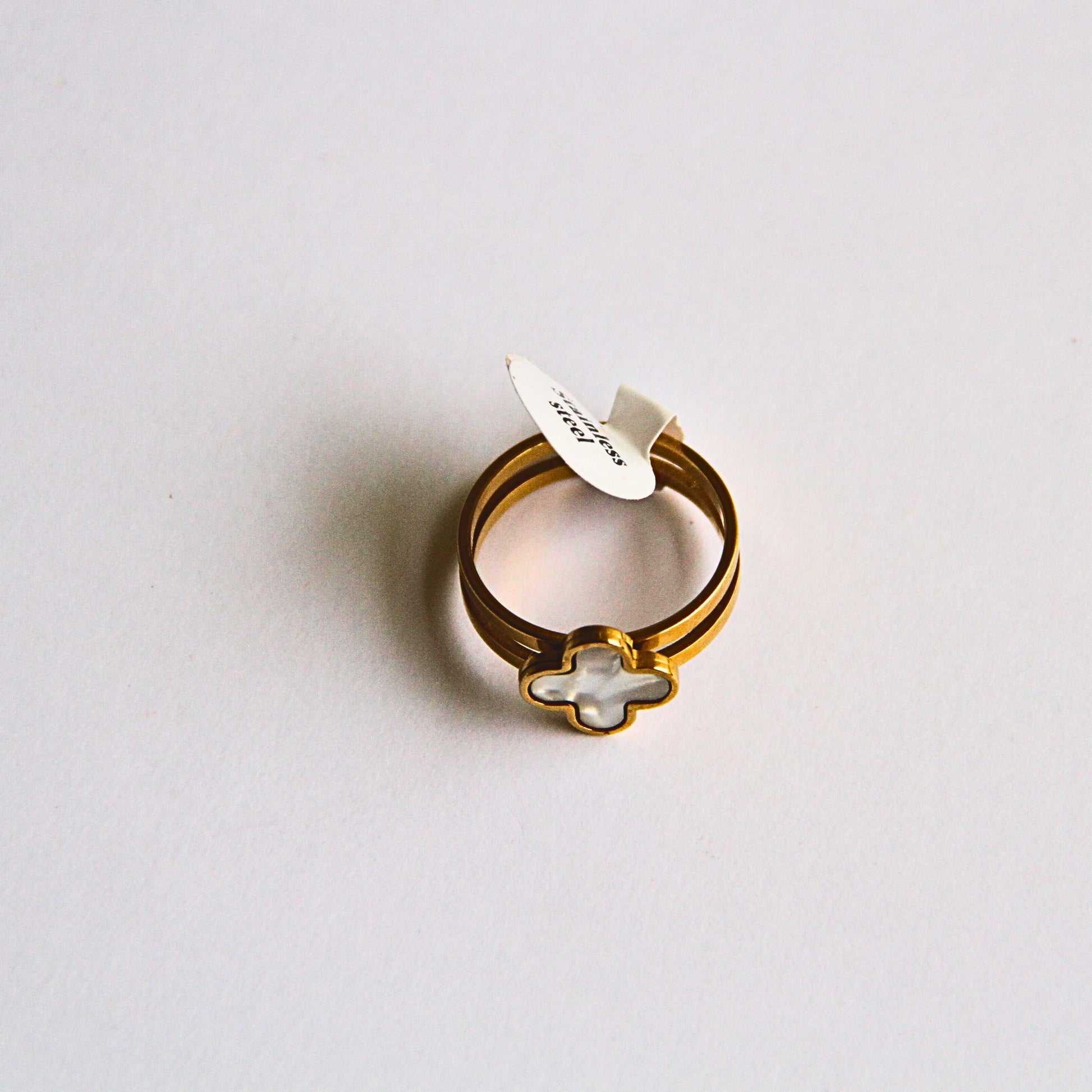 Bring timeless charm to your look with this Gold Clover  Ring. Designed with a mother-of-pearl inlay shaped like a four-leaf clover, this piece captures both elegance and good luck. The gold-plated finish adds a luxurious shine, while its anti-tarnish coating ensures long-lasting wear. Perfect for daily elegance or special occasions.