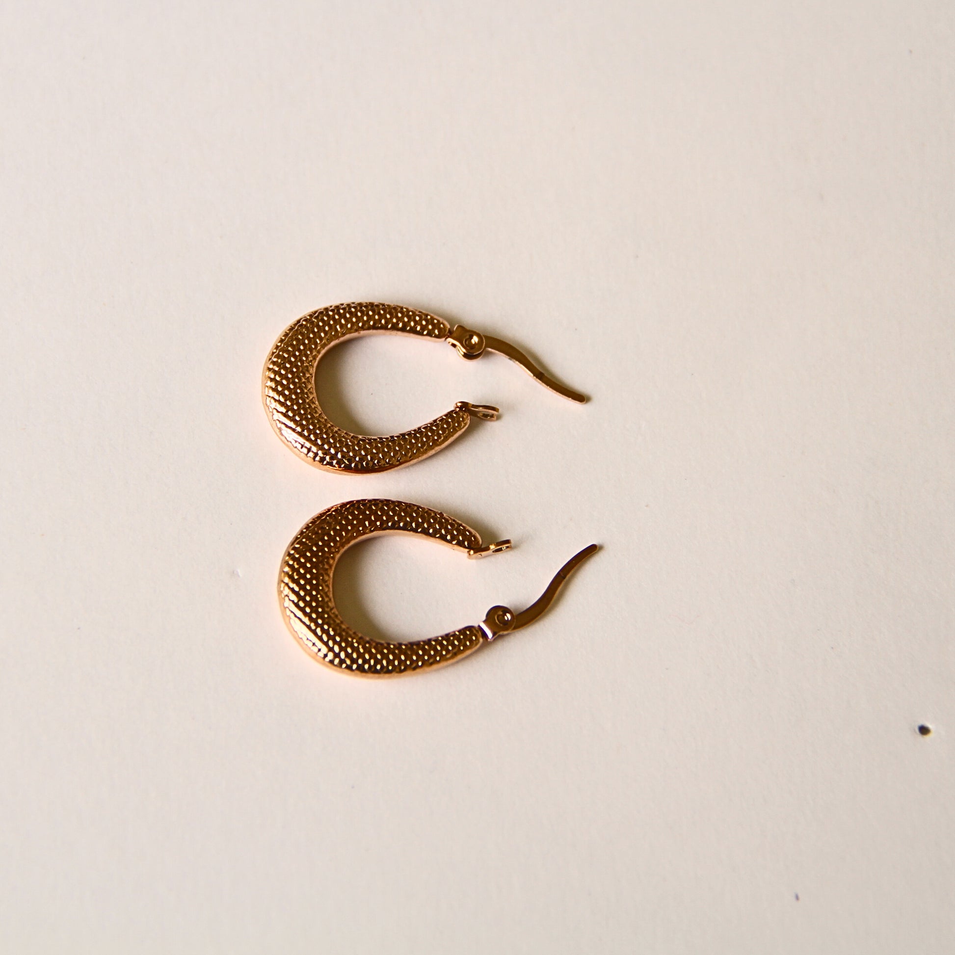 Embrace timeless elegance with these textured gold hoop earrings. Crafted with a rich, detailed finish and a graceful crescent shape, they bring a touch of vintage charm to any outfit. Designed for comfort and versatility, these anti-tarnish earrings are perfect for elevating your everyday look or adding a refined accent to evening wear.