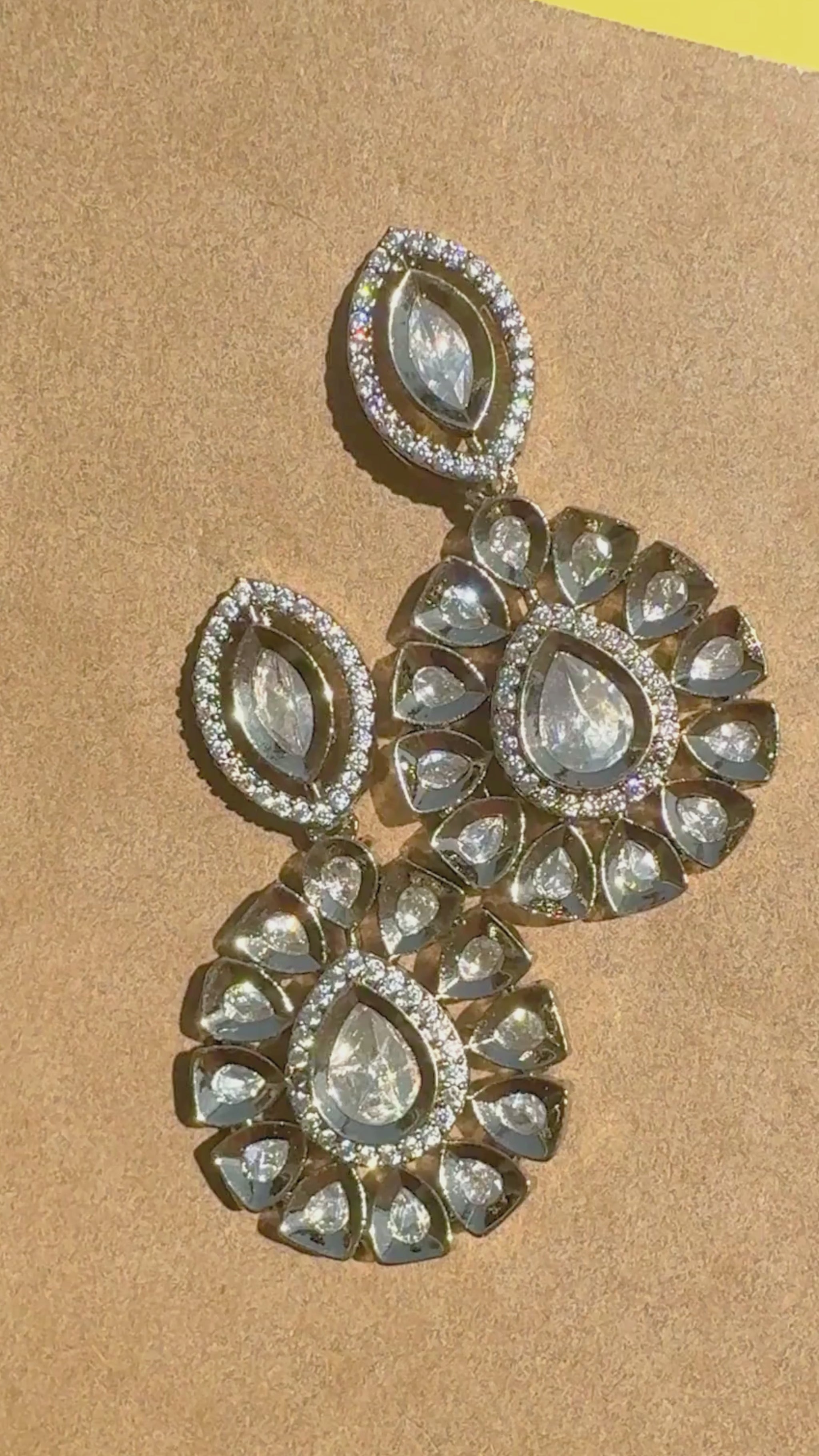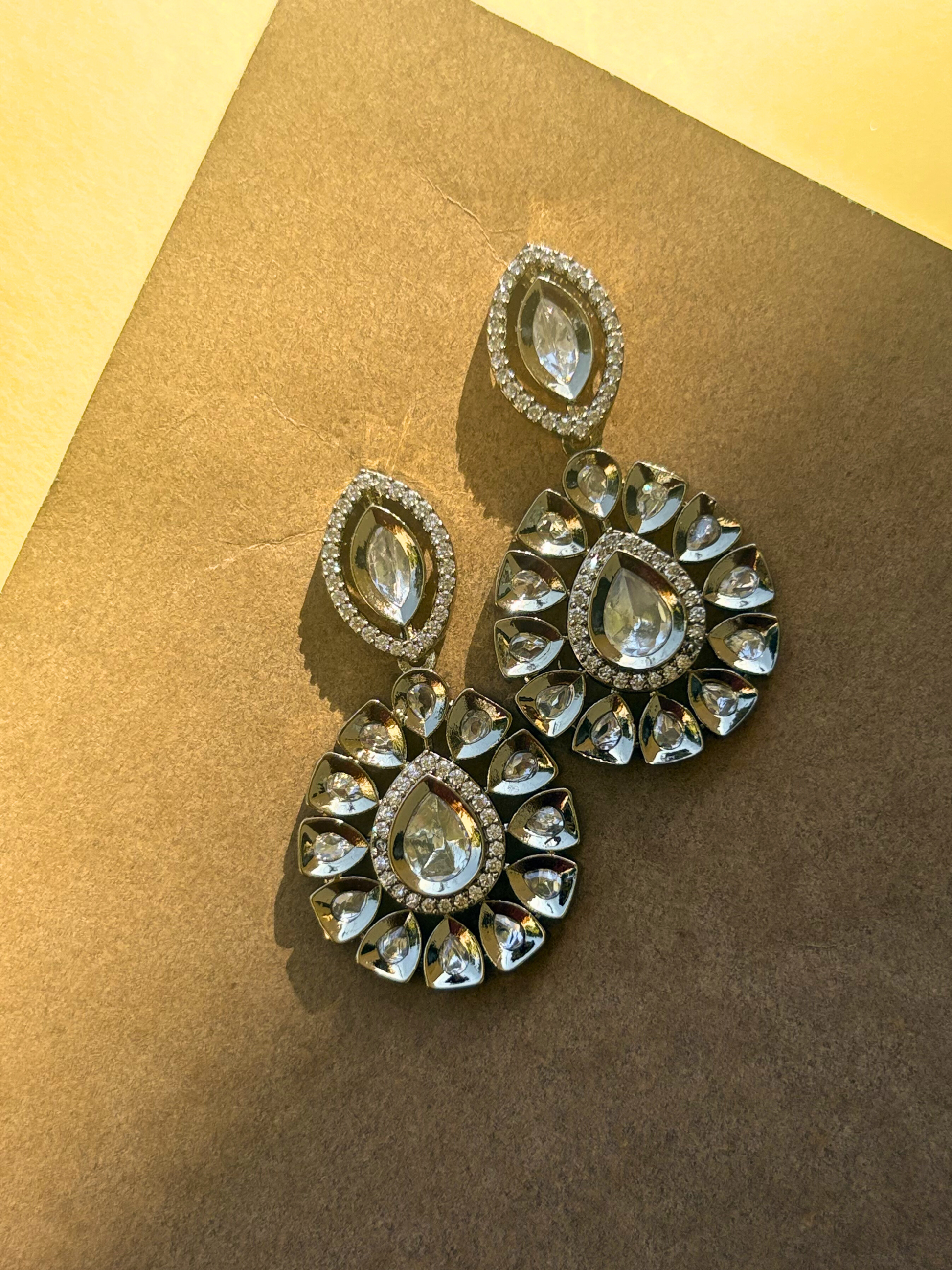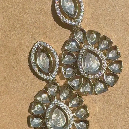 Make a statement with these vintage-inspired statement earrings. They feature high-clarity, champagne-toned American Diamonds (AD) set in a rich dark gold-tone finish. The design includes a striking marquise-cut top connected to a large, floral-inspired circular drop for maximum light reflection and sparkle.