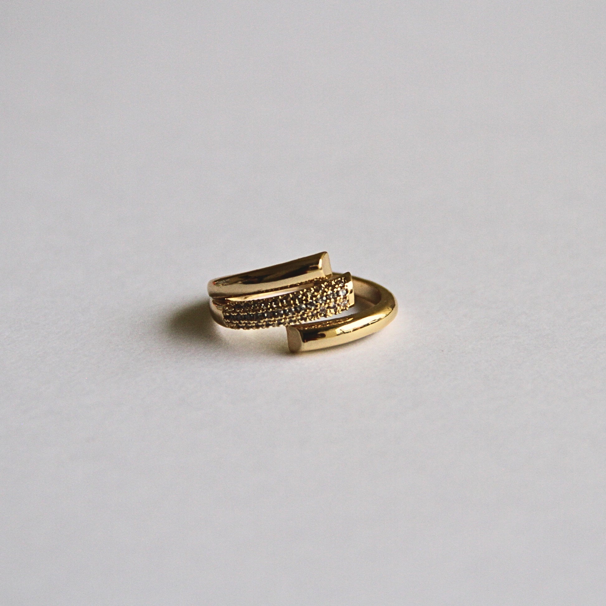 Elegant and versatile, this gold open ring features a sleek double-band style with a hint of sparkle. Perfect for stacking or wearing solo for a refined finish.