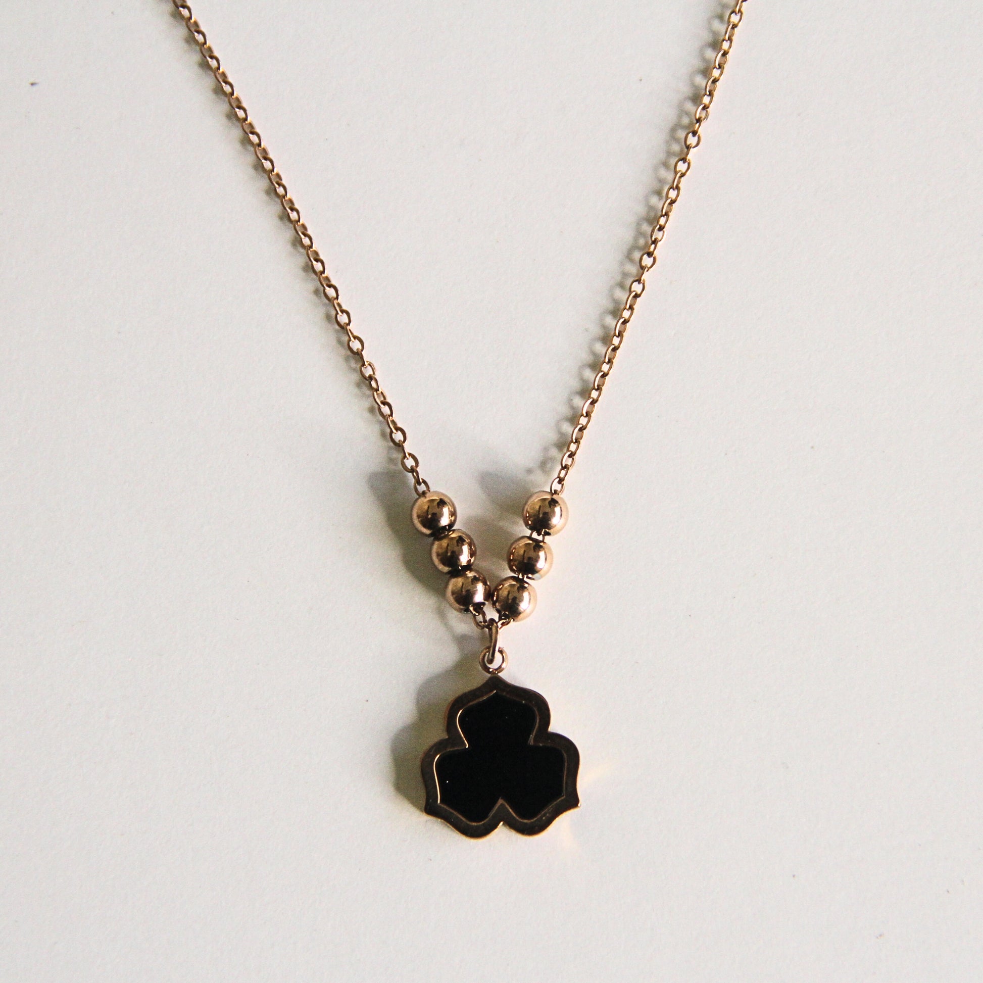 Add a touch of modern grace to your look with our Minimalist Clover Design Pendant Necklace. Featuring a sleek black and rose gold-tone clover pendant, this necklace is accented with delicate metal beads for a hint of sparkle. Its clean lines and refined design make it an ideal everyday accessory, effortlessly complementing both casual and elegant ensembles.