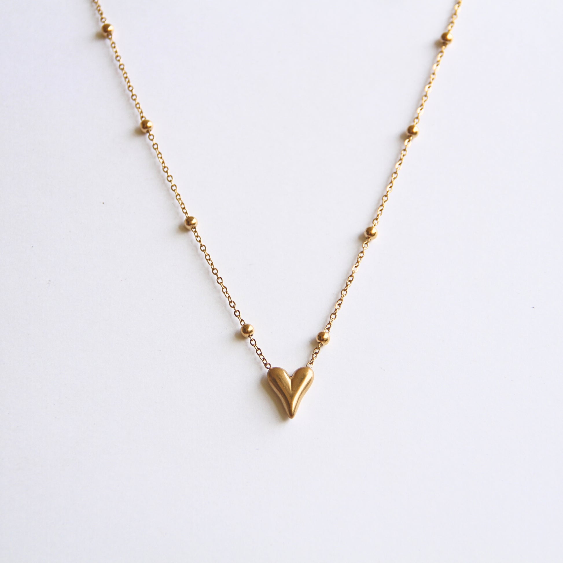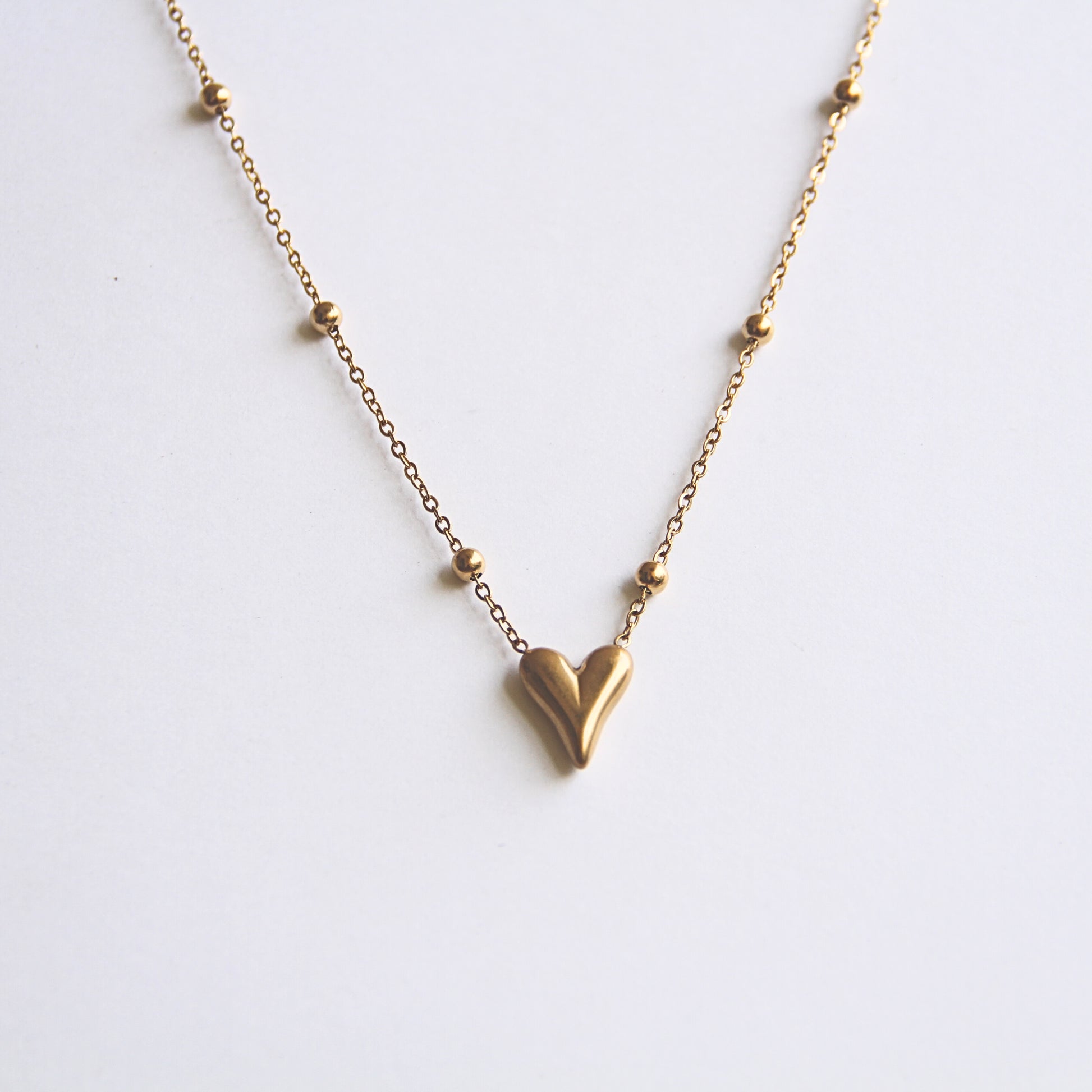 Embrace minimalist romance with our Minimalist Gold Tone Chain with Sculpted Heart Pendant. This chic necklace features a gracefully shaped, three-dimensional heart charm that serves as a beautiful focal point. Suspended from a slender gold-tone chain adorned with tiny metallic beads, this piece offers understated elegance and a heartfelt sentiment, ideal for everyday wear or as a meaningful present.
