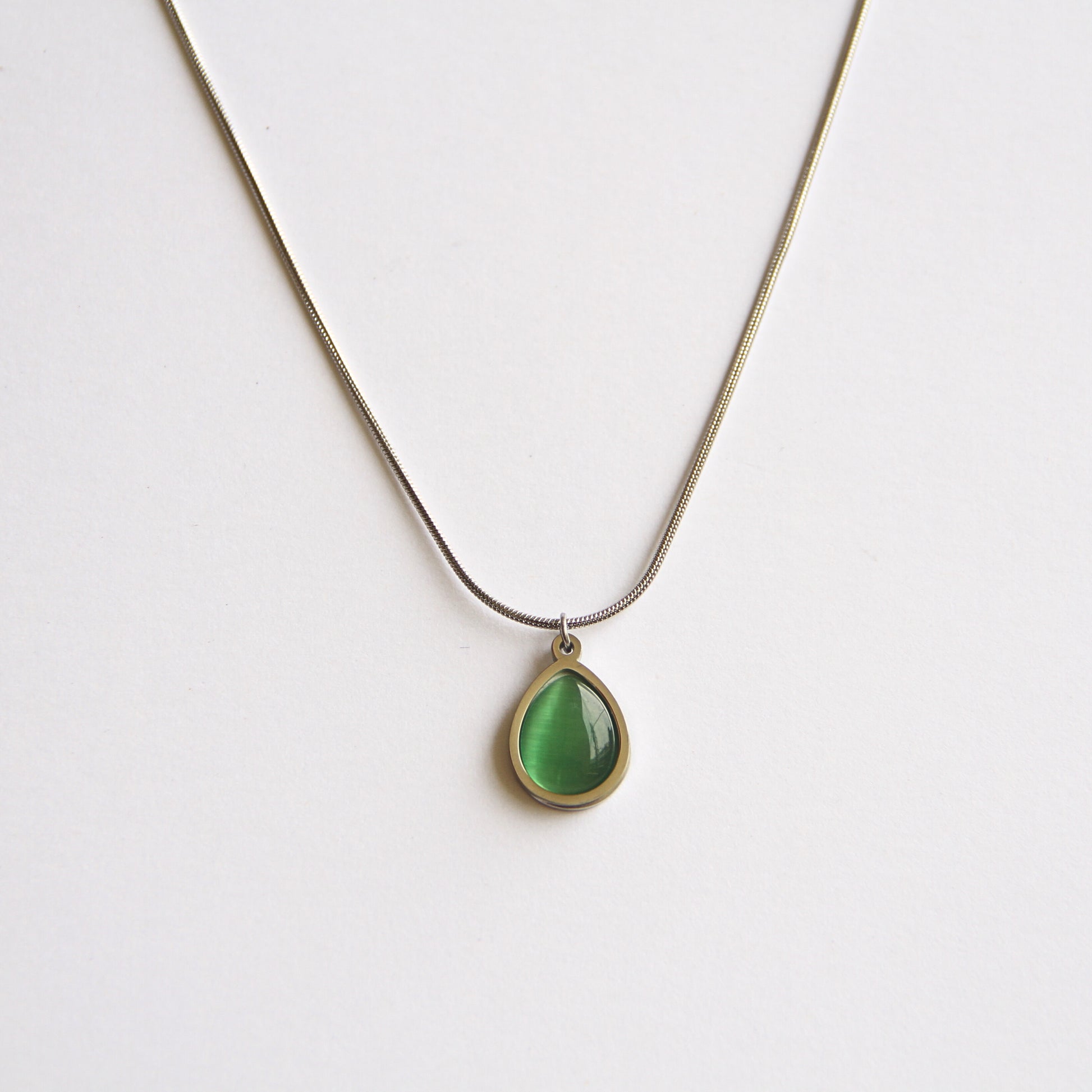 Discover understated beauty with our Minimalist Silver Tone Necklace, featuring a Luminous Green Teardrop Pendant. The focal point is a smooth, teardrop-shaped green gemstone with a captivating depth, encased in a sleek silver-tone bezel. This elegant pendant hangs gracefully from a refined silver-tone snake chain, making it a versatile accessory that complements both casual and sophisticated looks with its serene charm