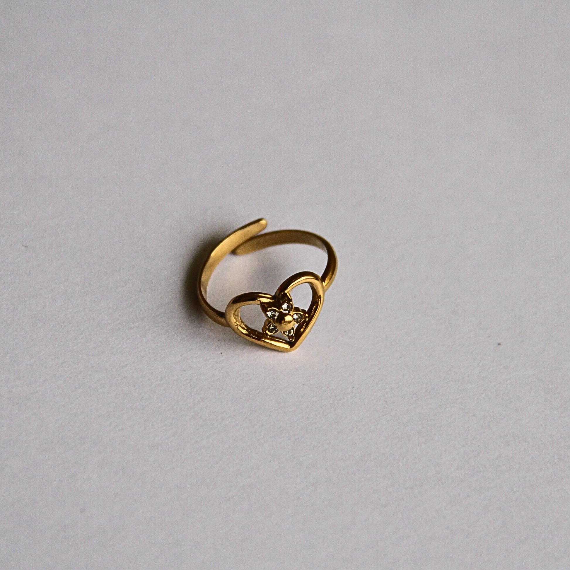 A dainty gold ring featuring a heart design with a tiny floral accent at its center. Lightweight, adjustable, and perfect for daily wear or gifting. The subtle shine adds a feminine touch to every look.