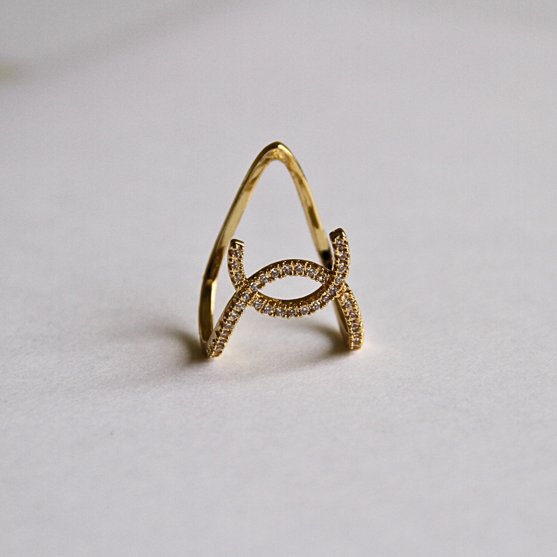 A modern gold ring with delicate crystal detailing — designed in a graceful crossover style that adds a refined sparkle to your everyday elegance.