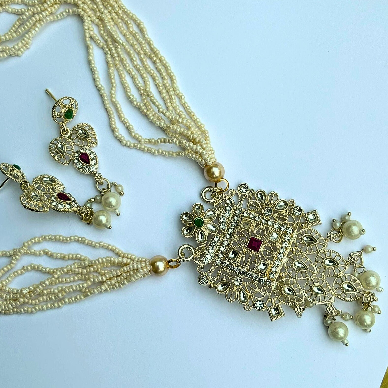 Adorn yourself with timeless charm in this multi-strand ivory beaded necklace set, featuring a square Kundan-style pendant and matching earrings. The detailed craftsmanship, highlighted with red and green accents and dangling pearls, beautifully blends traditional aesthetics with regal sophistication.